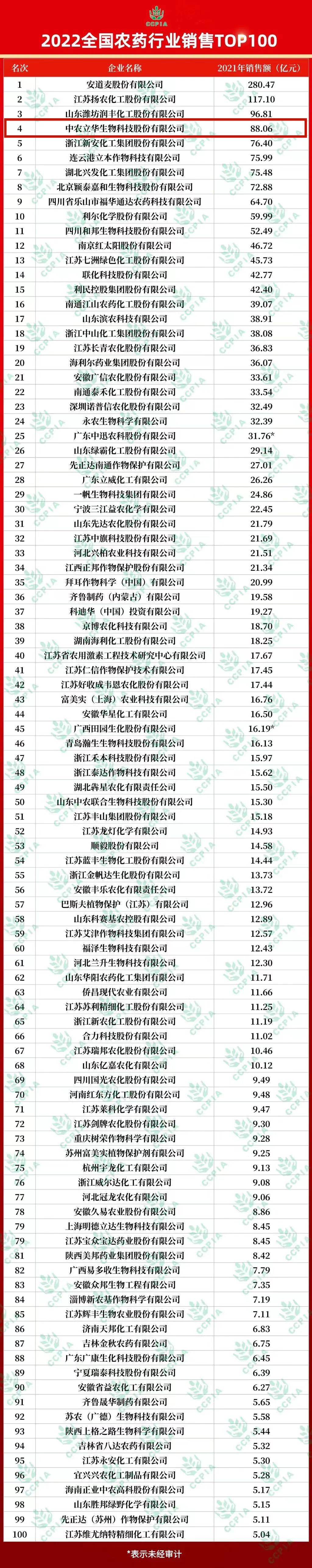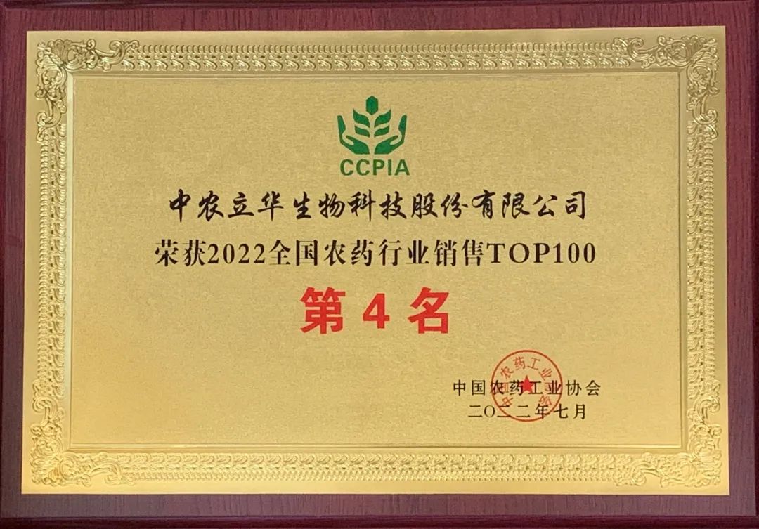7月7日,在浙江绍兴举办的第九届农药行业经济运行分析会暨2022农药行业排行榜发布会上,中国农药工业协会发布了“2022全国农药行业销售TOP100”榜单。中农立华生物科技股份有限公司以88.06亿元的销售额荣获第4名。