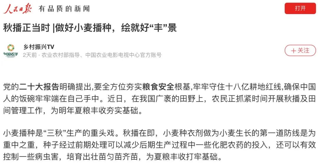 11月11日,人民日报客户端、澎拜新闻客户端、今日头条等多家媒体刊发《秋播正当时 |做好小麦播种,绘就好“丰”景》一文,报道了中农立华江苏拌种服务团队积极指导农户开展小麦种子处理工作,提升小麦发芽率,减少病虫害,全力以赴为明年夏粮丰收夯实基础。