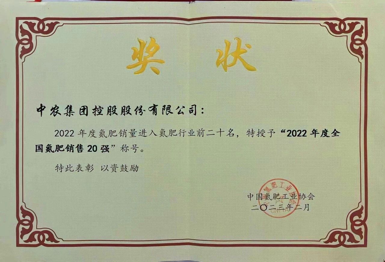 2022年,中农控股积极响应国家号召,主动扛起农资企业维护国家粮食安全的政治责任,带头稳定氮肥价格和市场供应,圆满完成春耕保供任务;密切关注市场形势,按照储备管理要求,保质保量投放货源,勇于承担稳定市场的主渠道责任;及时向政府有关部门、氮肥协会反映行业保供稳价过程中出现的苗头性、倾向性问题。此次公司从众多优秀企业中脱颖而出,再度位列氮肥销售20强首位,这份荣誉不仅代表着行业对公司业务实力的认可,也表明公司氮肥操作团队刻苦钻研虚心好学,赢得了行业的好评与尊重。