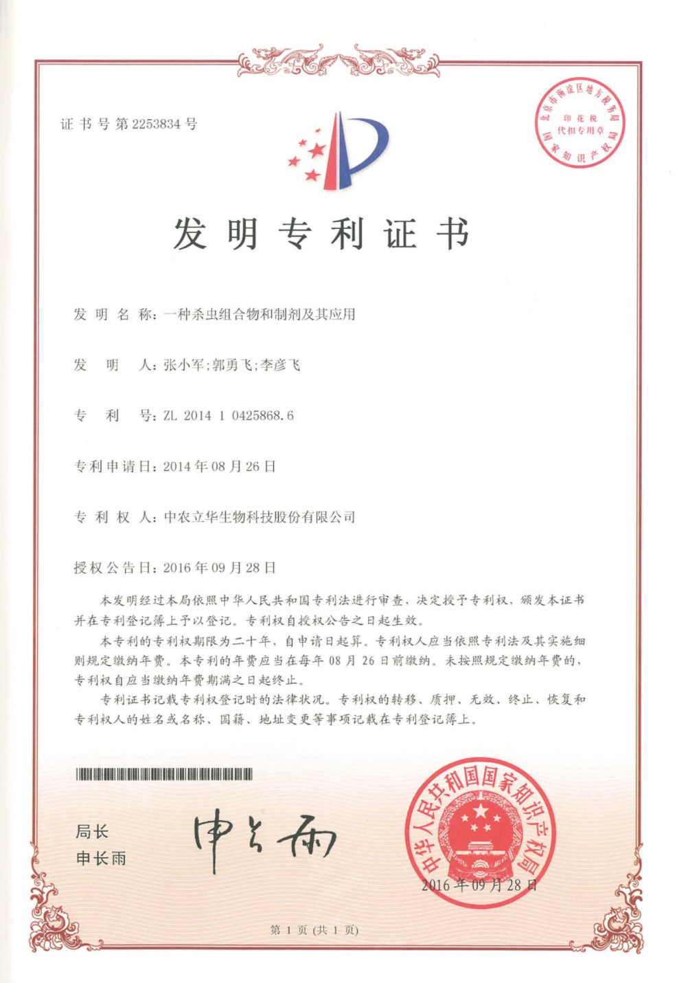 ®)是中农立华研究开发的新型复配农药制剂,2016年获得国家发明专利授权,专利名称:一种杀虫组合物和制剂及其应用,专利号:ZL 201410425868.6。