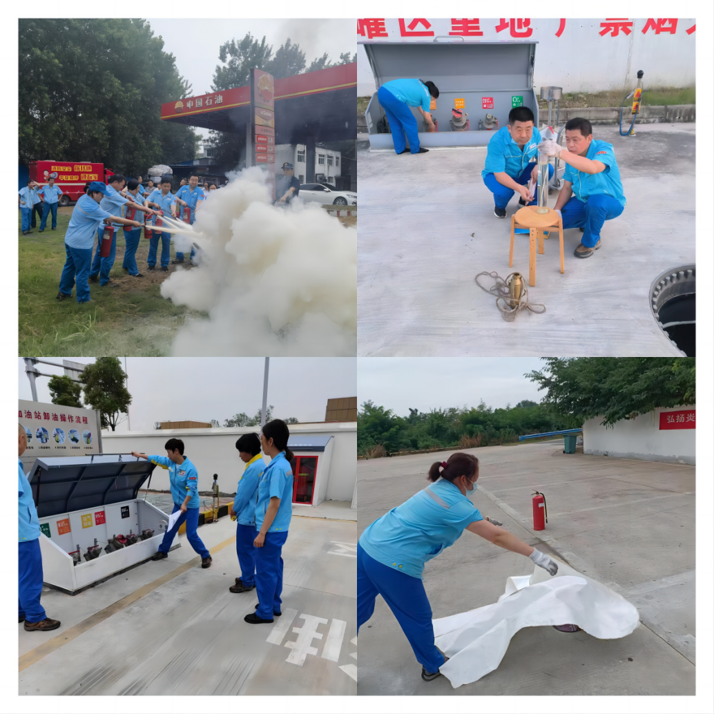 期间,分公司下辖加油站点分别积极与辖区内消防队开展各类应急演练活动:江汉片区与中石油江汉分公司、天门市消防支队开展安全互联共建活动,消防支队对发生火灾初期有关现场应急处置方案和对应措施及灭火器、灭火毯的使用原理以及注意事项进行了详细讲解,并组织全体员工开展消防灭火实战演练;随州片区根据站点实际,在高速停车区开展联合应急演练,演练以停车区起火应急处置为情景开展,员工逐一使用灭火器、灭火毯进行灭火,确保全员能够熟练使用消防器材,通过演练进一步检验应急预案的实用性和可操作性;荆门片区开展安全自查,站经理作为第一责任人带领站内全体员工对站内风险点逐一进行识别,重点针对火灾爆炸、油气泄露、交通事故、抢劫偷盗等安全风险点,制定防范、处置措施,形成表格,要求全员做到应知应会。
