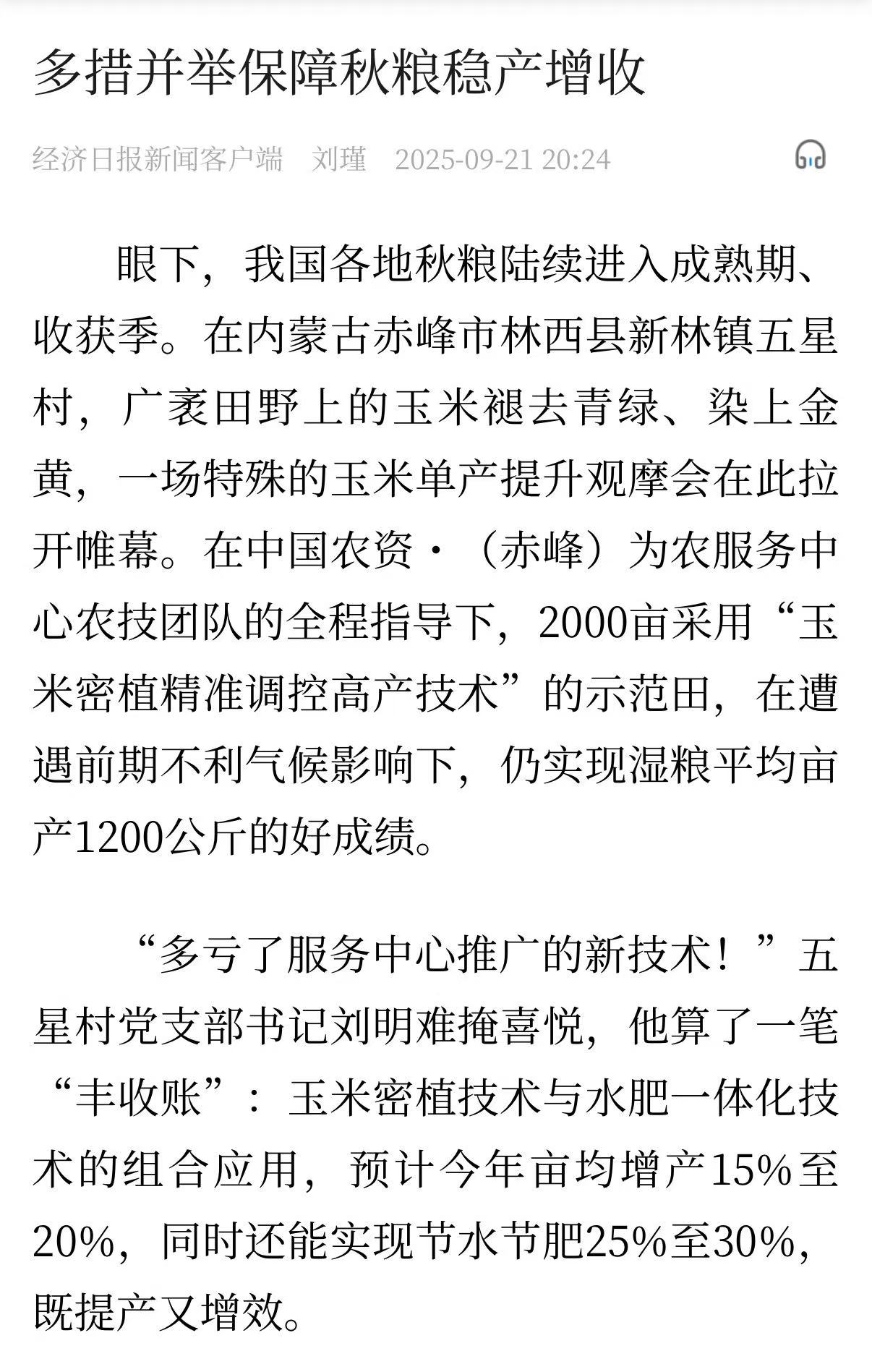 眼下,我国各地秋粮陆续进入成熟期、收获季。在内蒙古赤峰市林西县新林镇五星村,广袤田野上的玉米褪去青绿、染上金黄,一场特殊的玉米单产提升观摩会在此拉开帷幕。在中国农资・(赤峰)为农服务中心农技团队的全程指导下,2000亩采用“玉米密植精准调控高产技术”的示范田,在遭遇前期不利气候影响下,仍实现湿粮平均亩产1200公斤的好成绩。