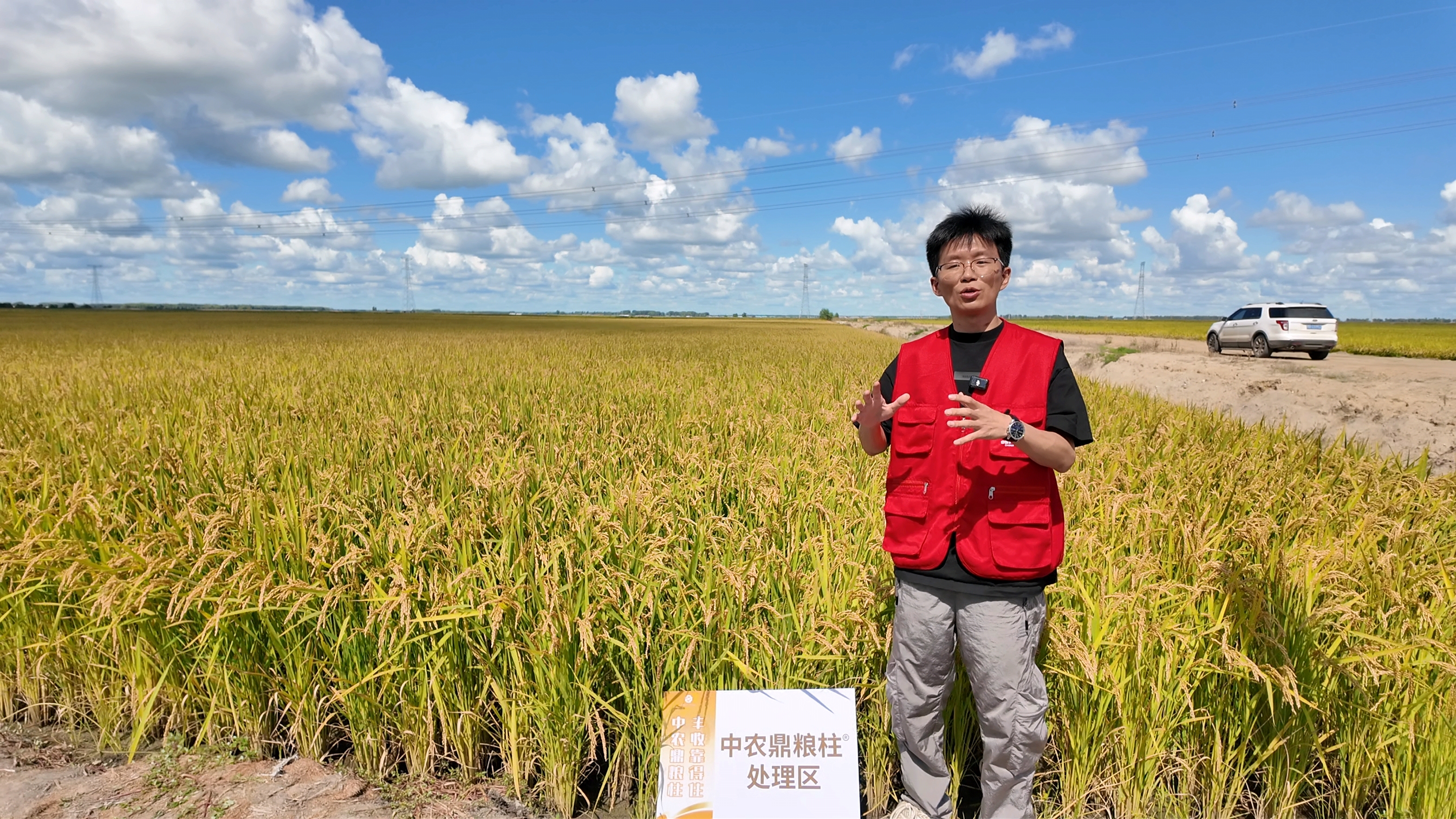 在孙喜臣的身旁,哈拉海农场种植大户薛海平手里攥着一把稻穗,对着镜头笑得爽朗:“我种了750亩地,今年头回使用‘中农鼎粮柱’方案,就按要求操作了一遍,稻子不仅没生病,上粮还快得很,几乎没有小穗和绿粒,增产肯定是没跑了!”