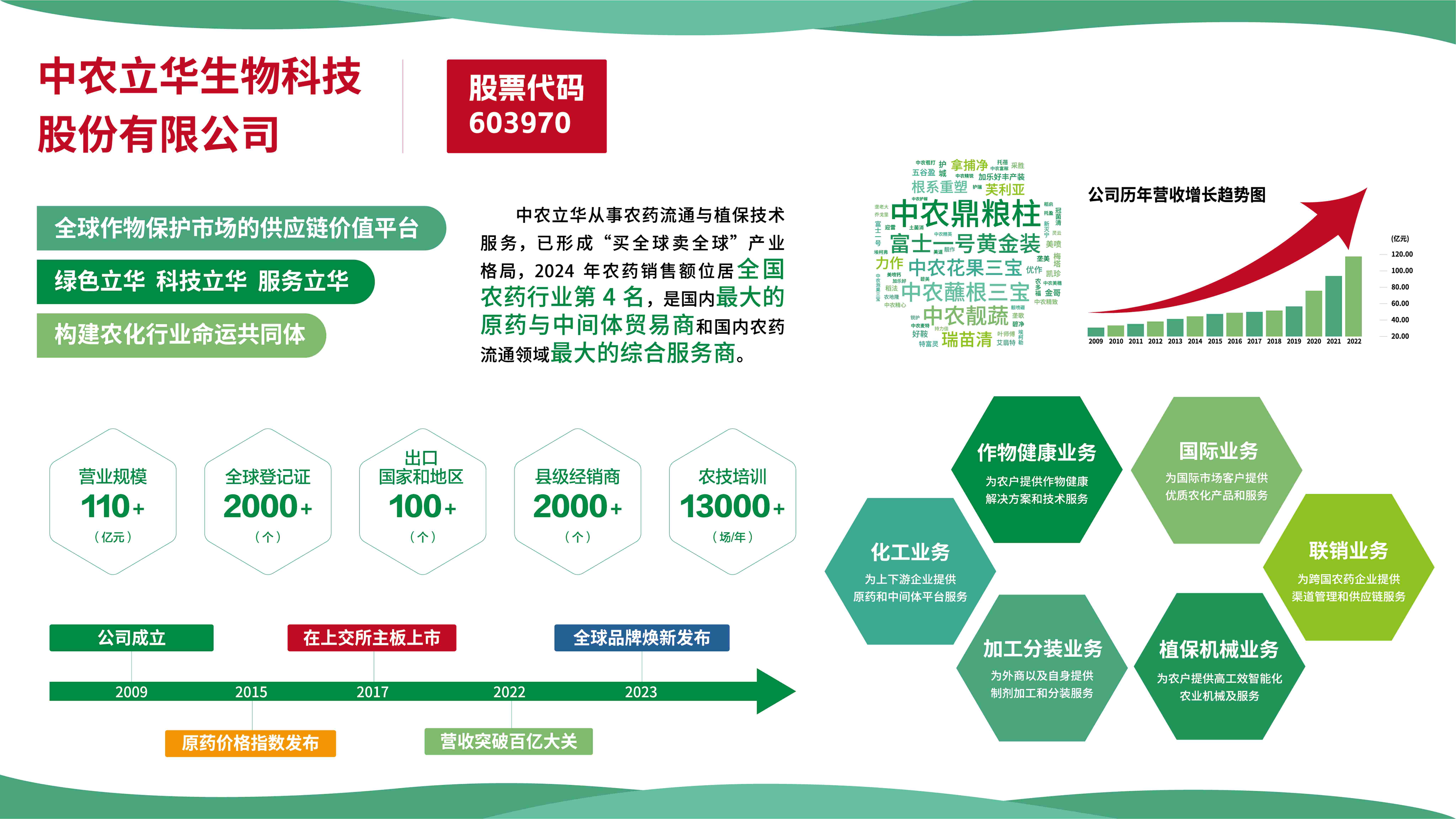 中农立华生物科技股份有限公司(以下简称“中农立华”)成立于2009年,主要从事农药流通与植保技术服务。2017年,在上海证券交易所主板挂牌上市(股票代码:603970)。目前已形成“买全球卖全球”的产业格局,经营规模位列全国农药行业第4名,出口规模位列全国农药行业第9名。