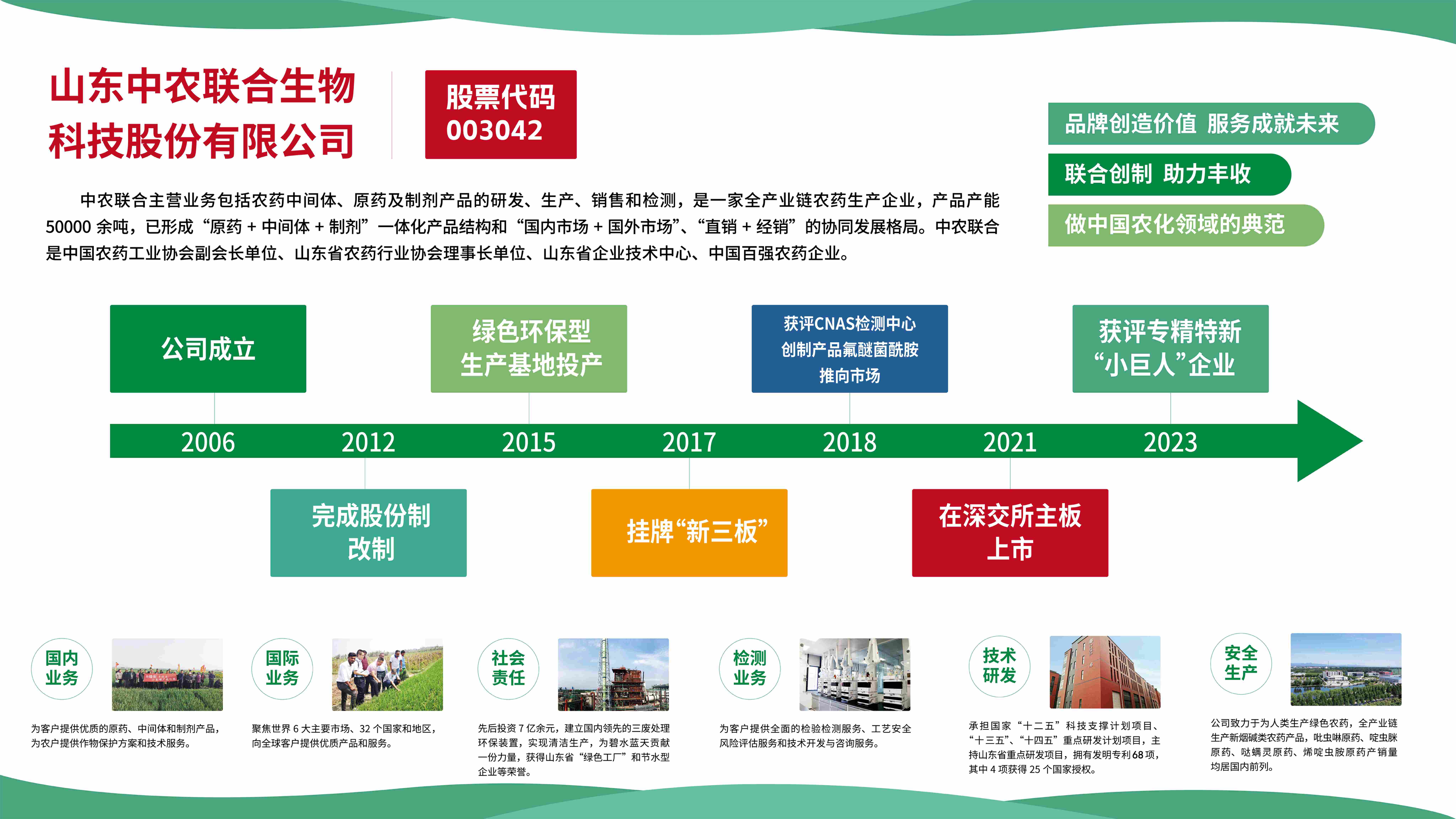 山东中农联合生物科技股份有限公司(以下简称“中农联合”)成立于2006年,主营业务包括农药中间体、原药及制剂产品的研发、生产、销售和检测,是一家全产业链农药生产企业。2021年,在深圳证券交易所主板上市(股票代码:003042),是深圳证券交易所主板和中小板合并后首批主板上市企业。