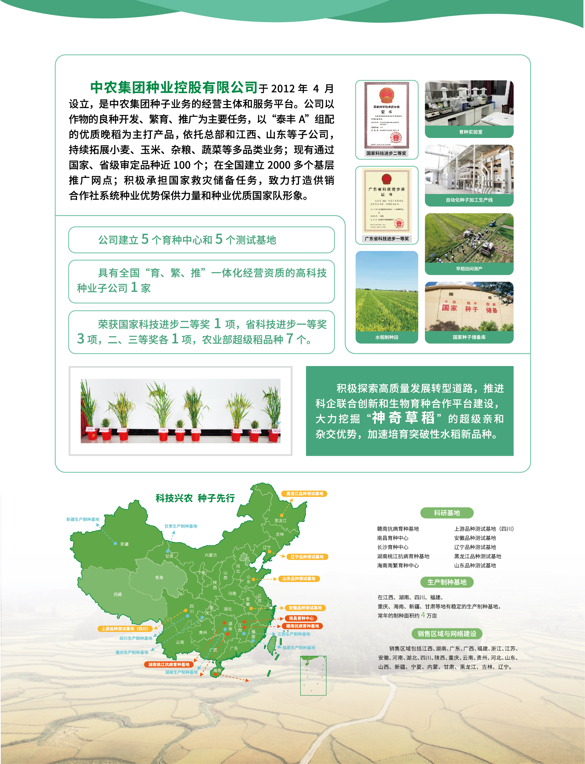 中农集团种业控股有限公司(简称“中农种业”)成立于2012年4月,注资资金2亿元,是中农集团种子业务经营主体平台。