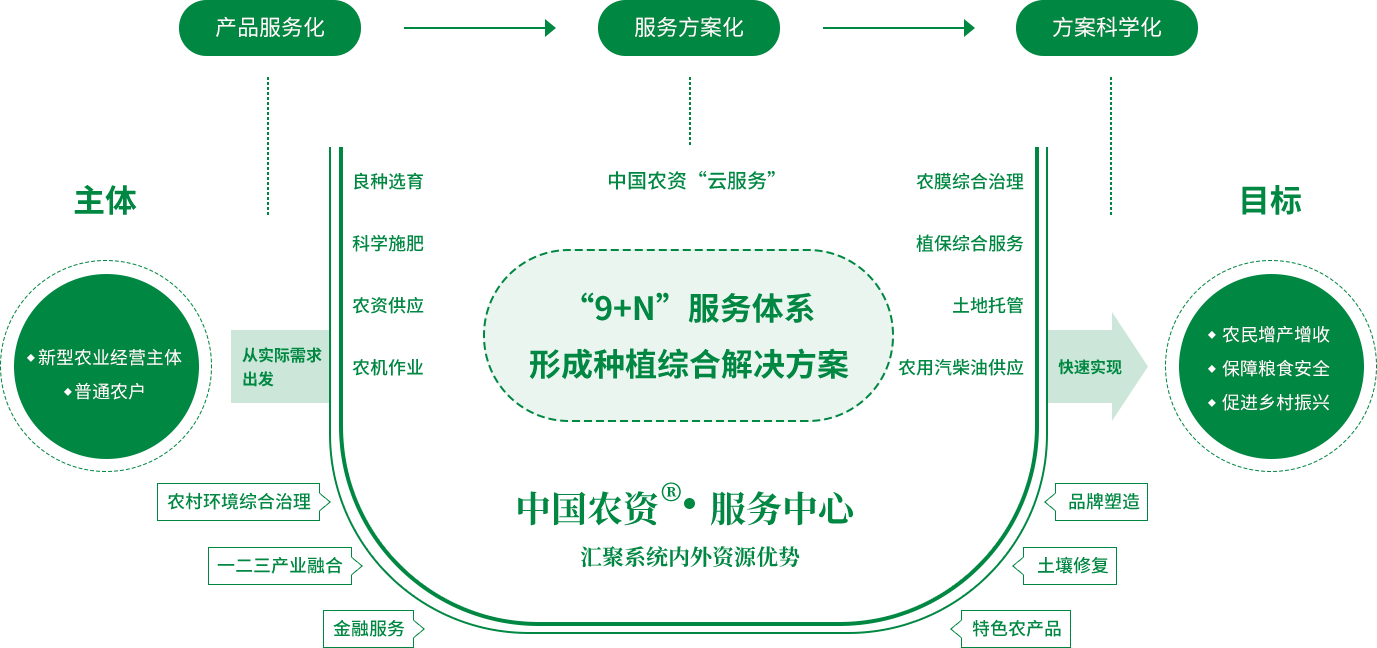 面对“谁来种地、地怎么种”的突出问题,中农集团坚持“业务平台化、服务综合化”原则,以中农集团现代农业服务有限公司(简称“中农农服”)为主要载体,发挥农资供应和农技服务优势,协同内外部优质资源,积极打造为农服务生态圈。