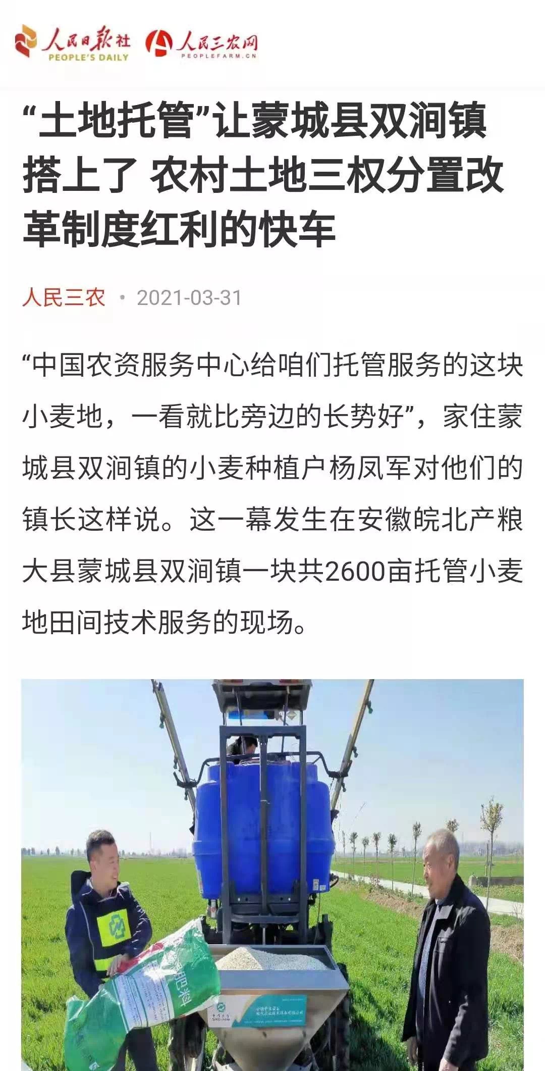 3月31日,人民三农客户端发布报道《“土地托管”让蒙城县双涧镇搭上了农村土地三权分置改革制度红利的快车》,介绍了在财政部、供销总社和供销集团的大力支持下,中农集团通过“新网工程”资金投资建设的中国农资阜阳服务中心(中农国昌)项目,在助农增收、推进乡村振兴和实现农业农村现代化所做出的探索和取得的成效。