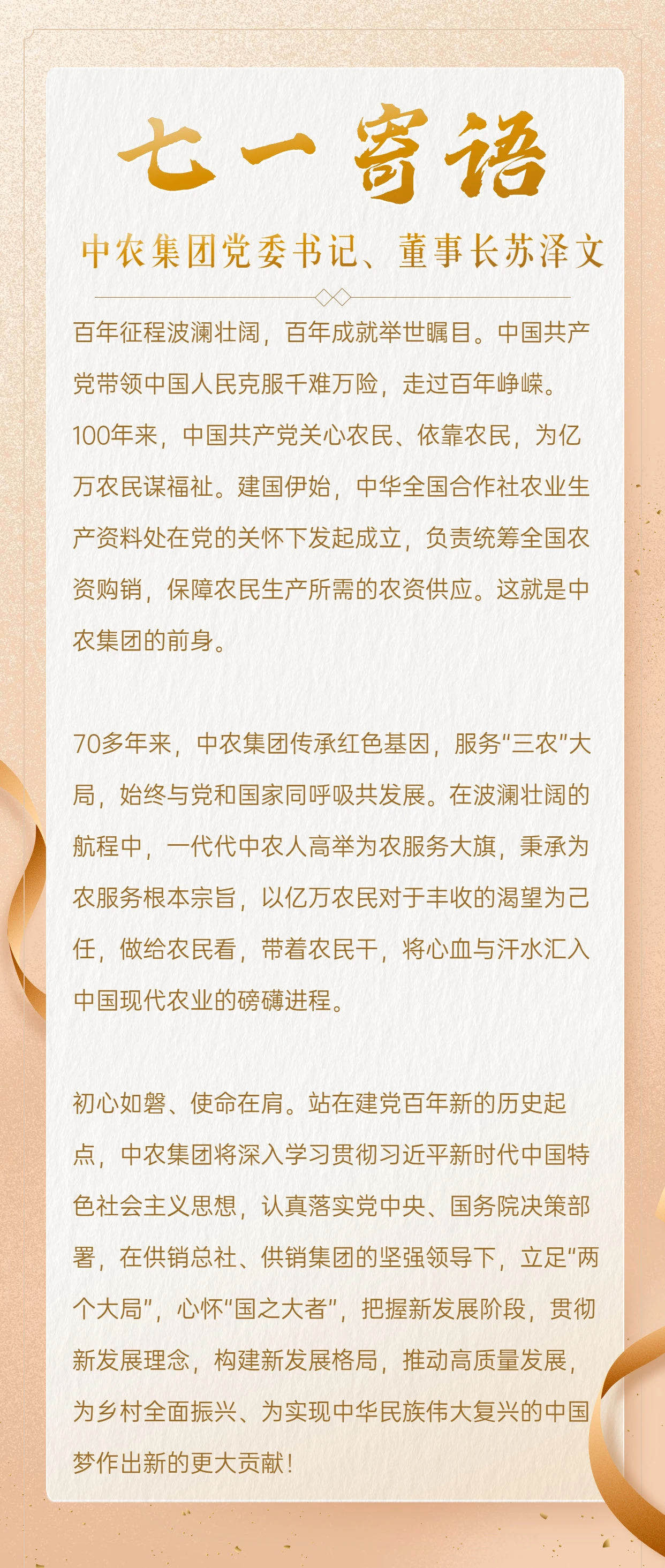 下一个百年,以乡村全面振兴为起点,中农集团将深化改革,抓住重要战略机遇期,担当新使命,在百年征程中续写新辉煌!