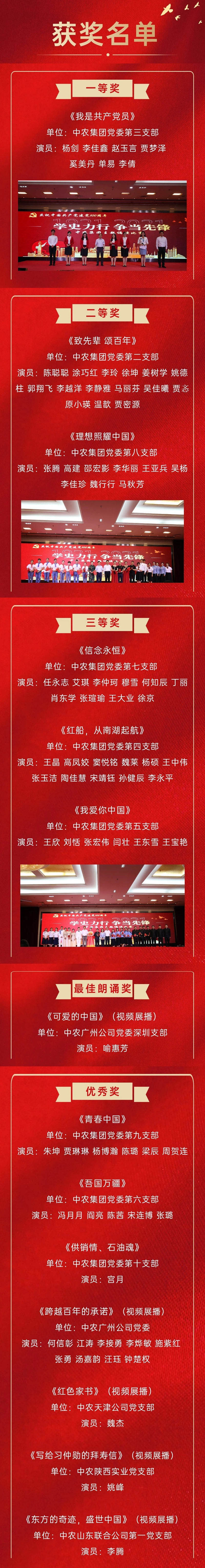 此外,由中农天津公司党支部朗诵的《红色家书》、中农陕西实业党支部朗诵的《写给习仲勋的拜寿信》、中农联合第一党支部朗诵的《东方的奇迹、盛世中国》、中农广州公司党委深圳支部朗诵的《可爱的中国》、中农广州公司党委朗诵的《跨越百年的承诺》,都以鲜活的语言、饱满的激情,表达了中农人爱岗敬业的奉献精神,情感真挚,打动人心。