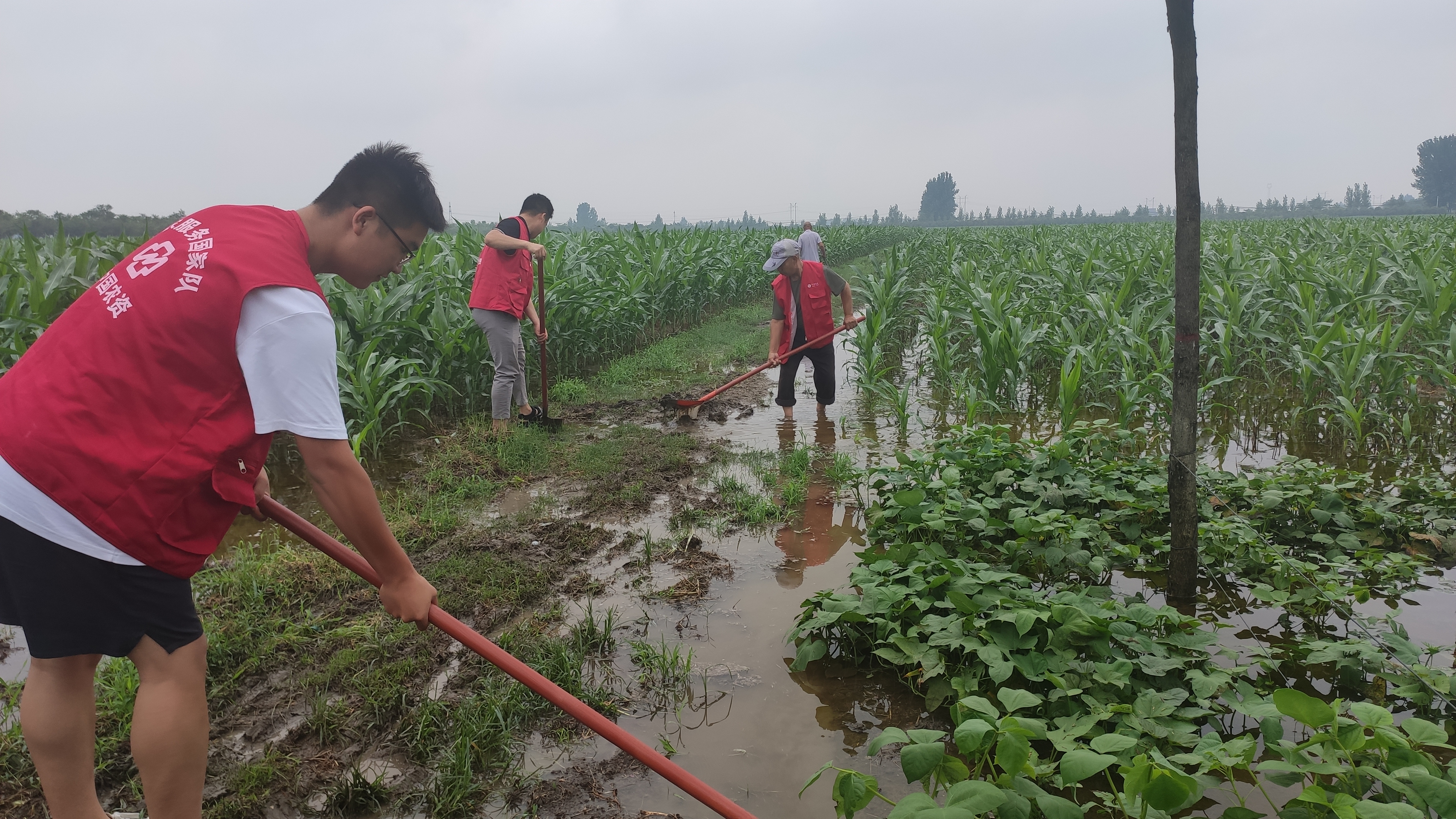 7月21日,中农控股河南平顶山宝丰服务中心第一时间组织农服人员走进田间地头查看受灾情况,面对大面积积水的玉米地,农服人员冒雨与农民一起开沟排水。