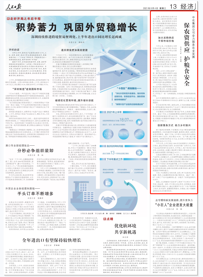 8月4日,《人民日报》第13版经济版刊发《中农集团公司全力服务农业发展 保农资供应 护粮食安全》一文,报道了中农集团全力保障农资供应,助力国家粮食安全,切实肩负起为农服务的重任。