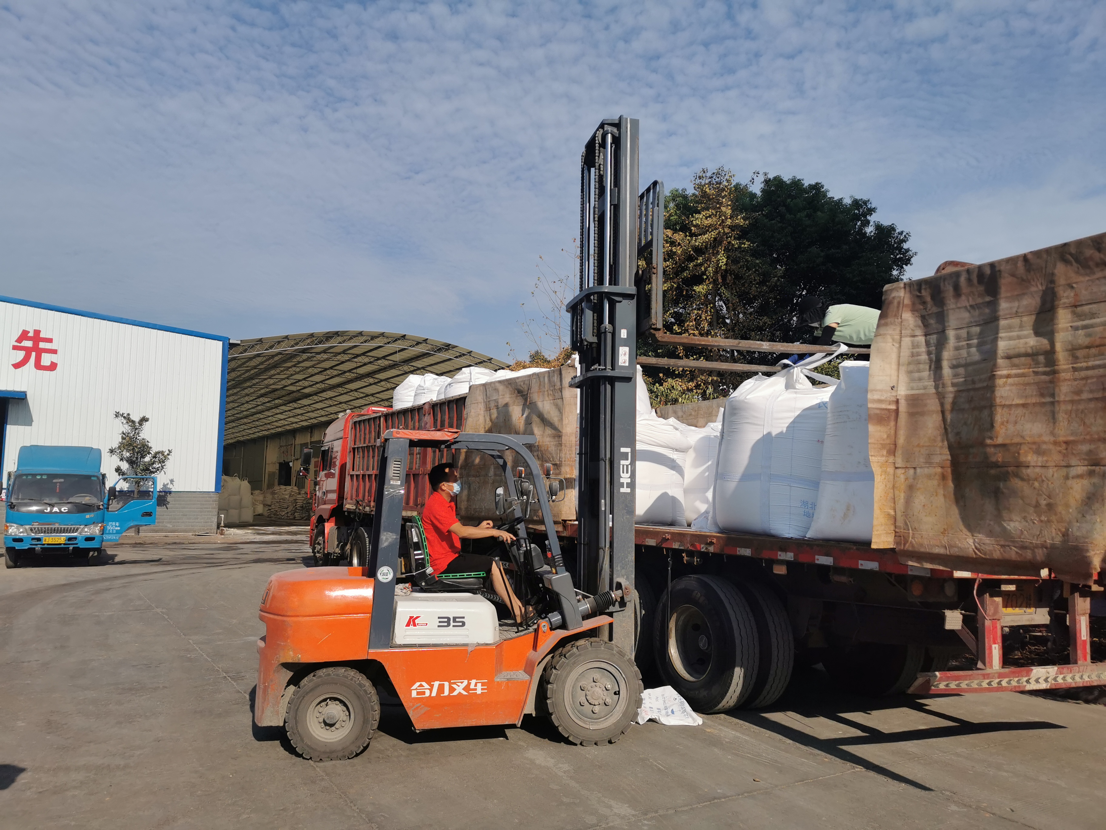 湖南隆科位于常德市汉寿县的生产基地内,化肥造粒机、翻堆机等机械在轰隆运转,工人们在生产线上有条不紊地配合机械进行肥料加工、装封与运输。
