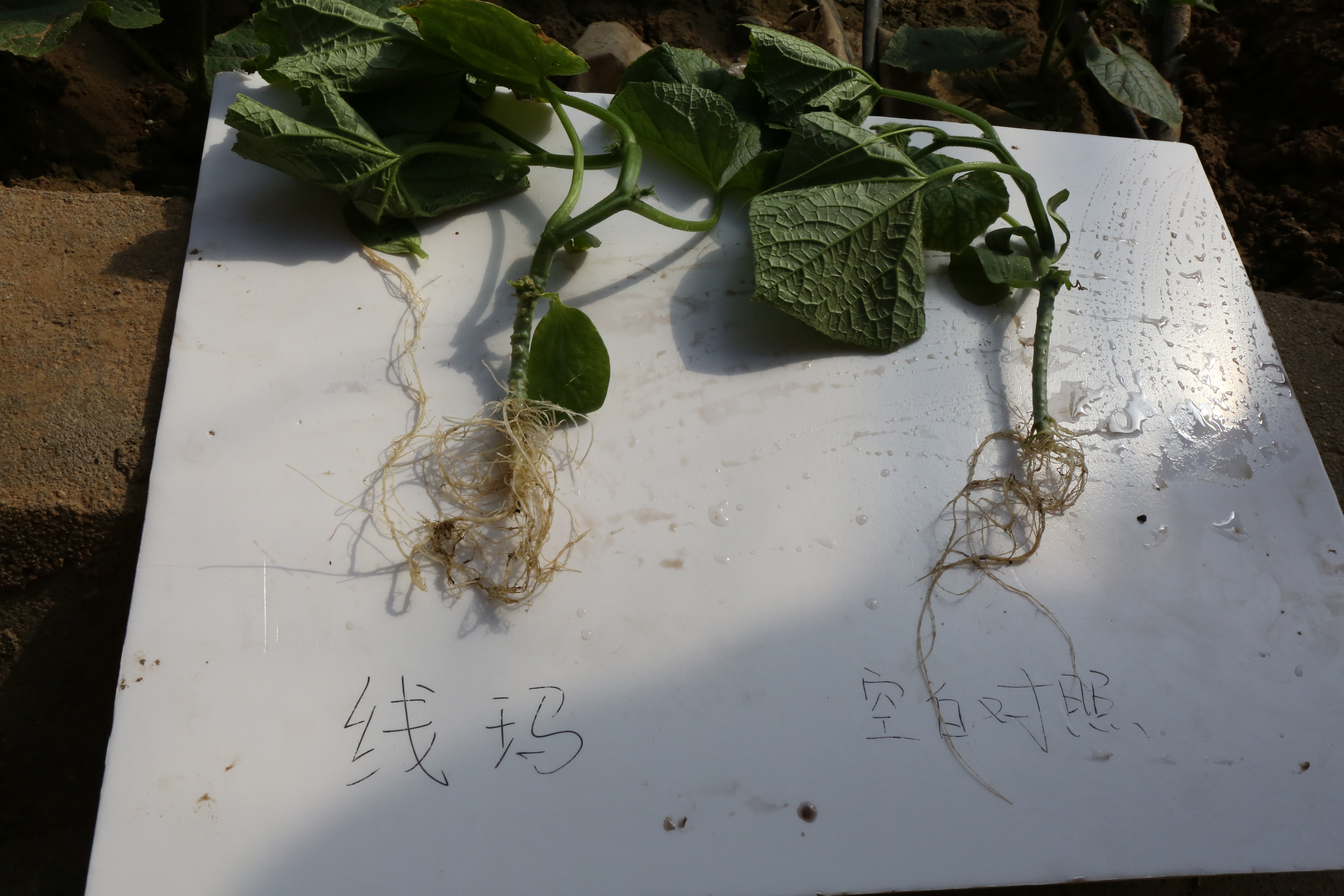 闷热的大棚内,科研人员正在对新药试验组、常规用药组和空白对照组的作物进行根系比照。使用“线玛”“根朵朵”的试验组根系粗壮,无线虫感染后的根瘤现象。而常规用药组和空白对照组,不同程度得被感染,并且根系稀疏无力。