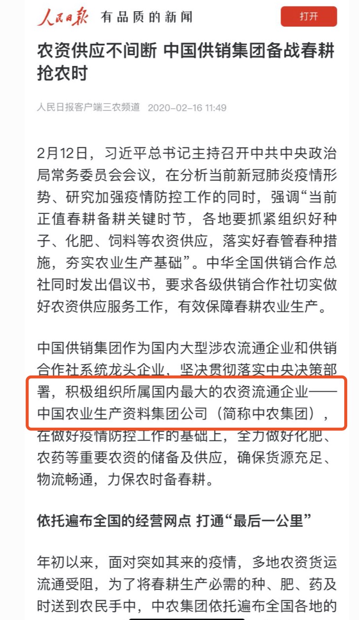 2月16日上午,人民日报客户端三农频道刊发《农资供应不间断 中国供销集团备战春耕抢农时》一文,详细报道了中农集团在供销总社、供销集团的坚强领导下,做好疫情防控工作的同时,全力做好化肥、农药等重要农资的储备及供应,确保货源充足、物流畅通,力保农时备春耕。