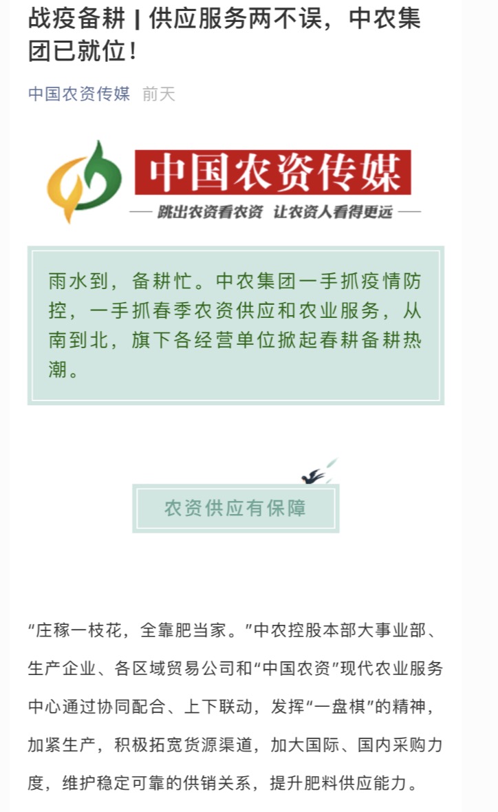 2月19日,中国农资传媒微信公众号长文刊发中农集团春耕备耕情况。