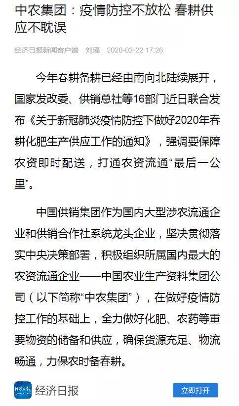 近期,中农集团在战疫情、保春耕方面的举措接连引起新华网、人民日报客户端等主流媒体关注报道。2月22日,经济日报客户端以《中农集团:疫情防控不放松 春耕供应不耽误》为题,对中农集团全力做好化肥、农药等重要农资储备及供应情况也进行了详细报道。