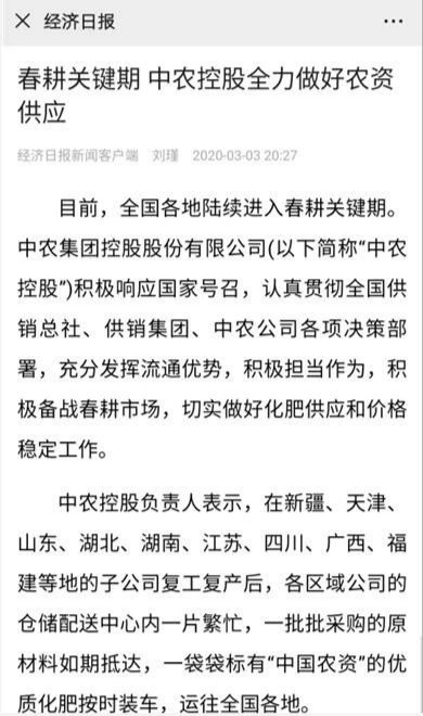 3月3日,经济日报新闻客户端刊发《春耕关键期,中农控股全力做好农资供应》一文,详细讲述了近期中农控股积极响应国家号召,在供销总社、供销集团和中农集团的领导下,全力做好化肥储备供应,确保货源充足、物流畅通,力保农时备春耕。