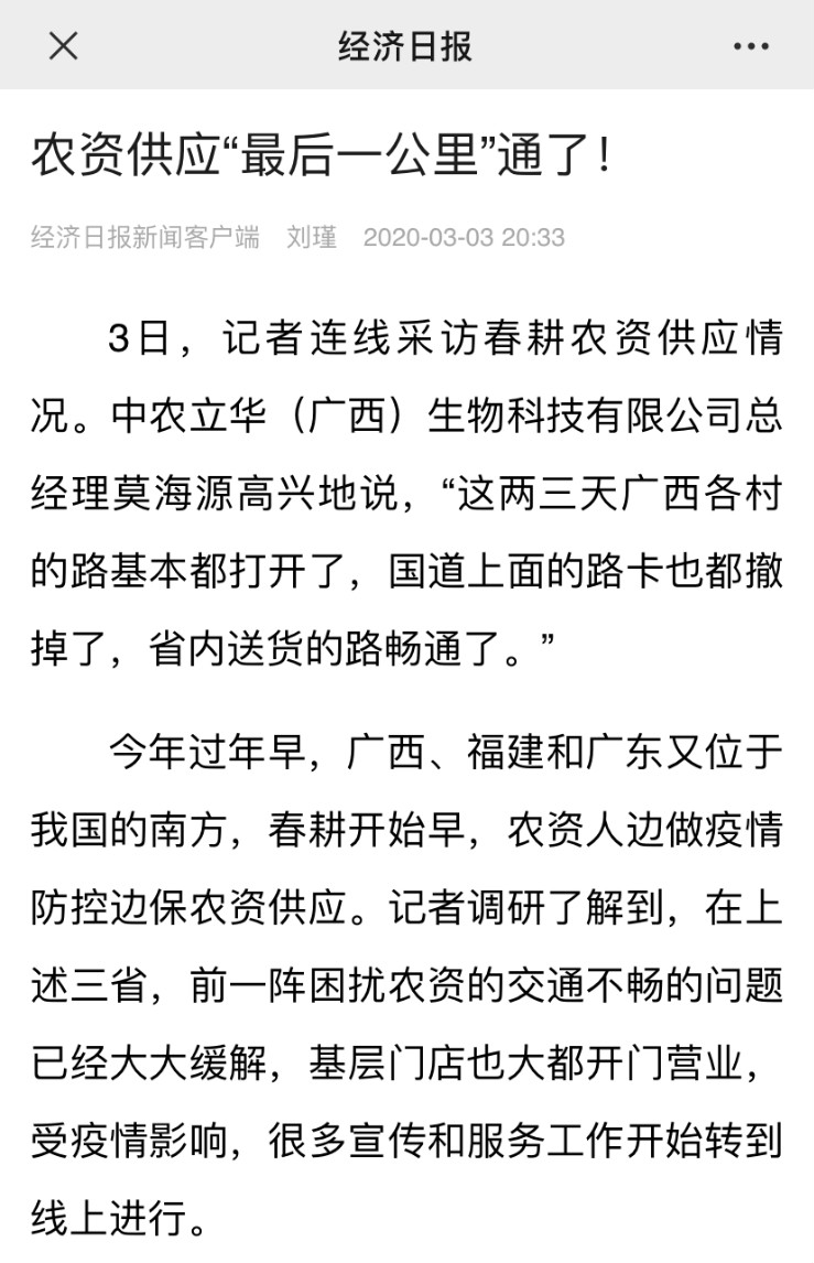 3月3日,经济日报新闻客户端刊发《农资供应“最后一公里”通了!》一文,报道了中农立华多措并举,及时保障基层春耕农资供应,彰显社有企业的责任与担当。