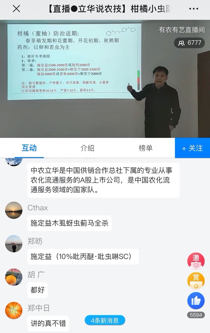 王清煌表示,现在会议不能开,公司开始转通过线上直播,安排人员到田间拍摄病虫害的视频、照片,通过《立华说农资》掌上微课开直播。春节过后,公司组织了七场,观看人数有18万左右。“直播期间的互动还有电话挺多,效果还是不错的。”