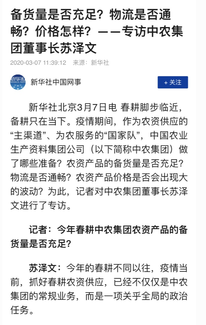 今天,新华社客户端刊发了2月27日对苏泽文董事长的专访报道。苏董事长根据当时的情况,客观解答了关于春耕农资备货量、物流发运及价格三方面问题,并提出相关建议。