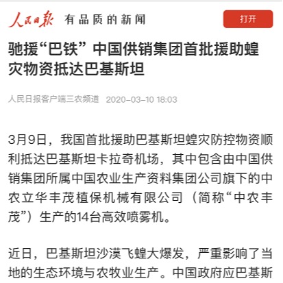 3月10日,人民日报客户端三农频道刊发《驰援“巴铁” 中国供销集团首批援助蝗灾物资抵达巴基斯坦》,报道了中农立华旗下中农丰茂高效喷雾机入选我国首批援助巴基斯坦蝗灾防控物资,助力巴方有效控制蝗灾。