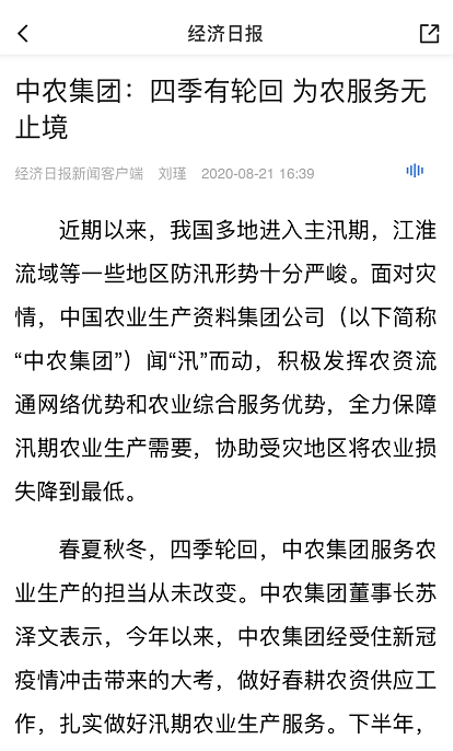 近日,经济日报客户端刊发报道《中农集团:四季有轮回 为农服务无止境》,董事长苏泽文在文中表示,今年以来,中农集团经受住新冠疫情冲击带来的大考,做好春耕农资供应工作,扎实做好汛期农业生产服务。下半年,中农集团将继续坚持稳字当头、稳健经营,保障农资产业链供应链稳定,为“十三五”圆满收官贡献中农力量。