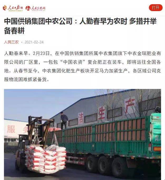 2月24日,人民日报人民三农客户端刊发《中国供销集团中农公司:人勤春早为农时 多措并举备春耕》,报道了中农集团在春耕备耕关键时期,春节期间坚守岗位,抢抓农时,为农资稳定供应、物流畅通和农民科学种田保驾护航。