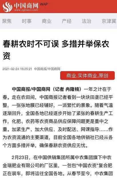 2月24日,中国商报官方网站中国商网刊发报道《春耕农时不可误 多措并举保农资》,提到中农集团“不误农时,保障农资产业链、供应链稳定”。