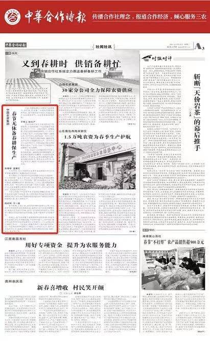 2月22日,《中华合作时报》A3版头条刊发《又到春耕时 供销备耕忙》,报道了中农集团干部职工春节坚守岗位,保障春耕农资供应。