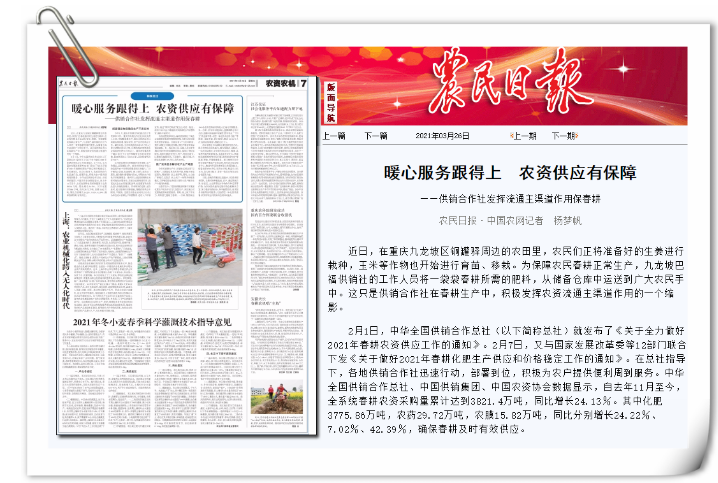 2月1日,中华全国供销合作总社(以下简称总社)就发布了《关于全力做好2021年春耕农资供应工作的通知》。2月7日,又与国家发展改革委等12部门联合下发《关于做好2021年春耕化肥生产供应和价格稳定工作的通知》。在总社指导下,各地供销合作社迅速行动,部署到位,积极为农户提供便利周到服务。中华全国供销合作总社、中国供销集团、中国农资协会数据显示,自去年11月至今,全系统春耕农资采购量累计达到3821.4万吨,同比增长24.13%。其中化肥3775.86万吨,农药29.72万吨,农膜15.82万吨,同比分别增长24.22%、7.02%、42.39%,确保春耕及时有效供应。