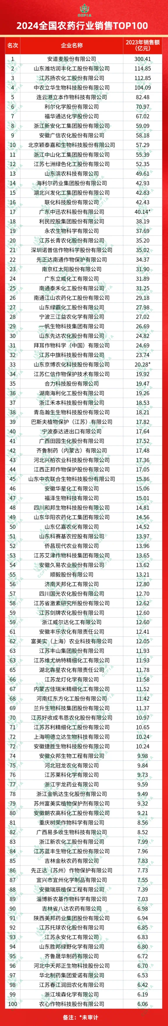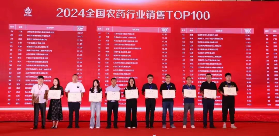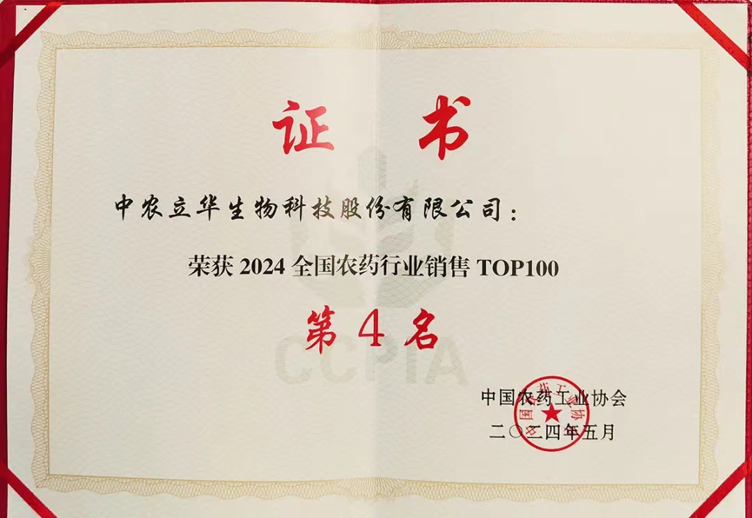5月21日,中国农药工业协会在河南郑州发布了2024全国农药行业销售TOP100名单,中农立华生物科技股份有限公司以104.09亿元的农药销售额荣获第4名。