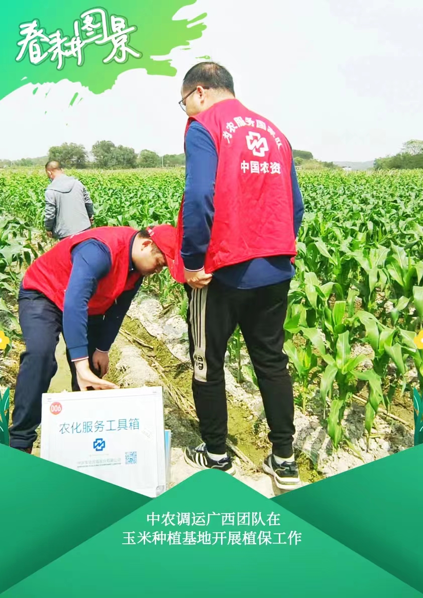 中农调运广西团队在南宁市江西镇,为200亩玉米种植基地提供托管服务,根据土壤检测结果及气候条件,制定“中国农资”水肥管理方案,并提供种植指导服务,助力农户丰产丰收。
