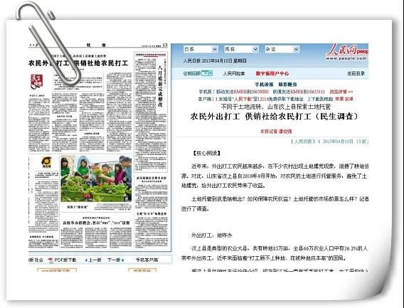 2013年4月18日,《人民日报》以《农民外出打工,供销社给农民打工》为题报道了汶上县开展土地托管服务的主要做法和成效。此后,“农民外出打工,供销社为农民打工”这句琅琅上口的口号从山东供销合作社系统传遍全国。