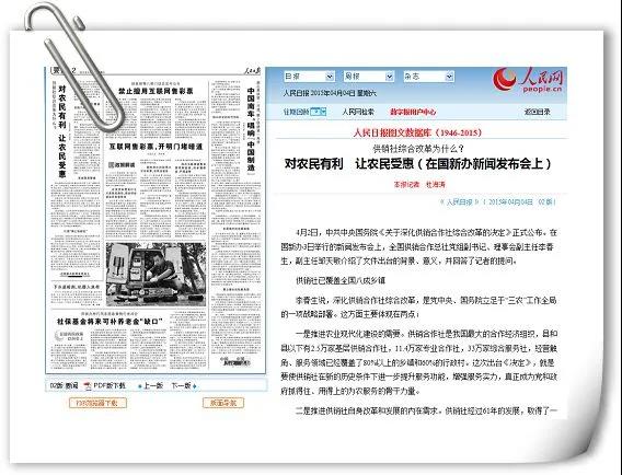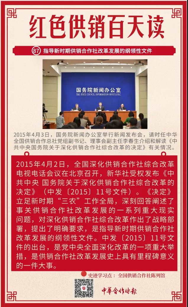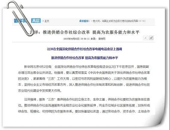2015年4月2日,全国深化供销合作社综合改革电视电话会议在北京召开,新华社受权发布《中共中央 国务院关于深化供销合作社综合改革的决定》(中发〔2015〕11号文件)(以下简称《决定》)。这是继1995年《中共中央 国务院关于深化供销合作社改革的决定》(中发〔1995〕5号文件)出台后,时隔20年再次以中共中央、国务院名义下发的供销合作社改革文件,充分体现了党中央、国务院对供销合作社工作一以贯之的高度重视。