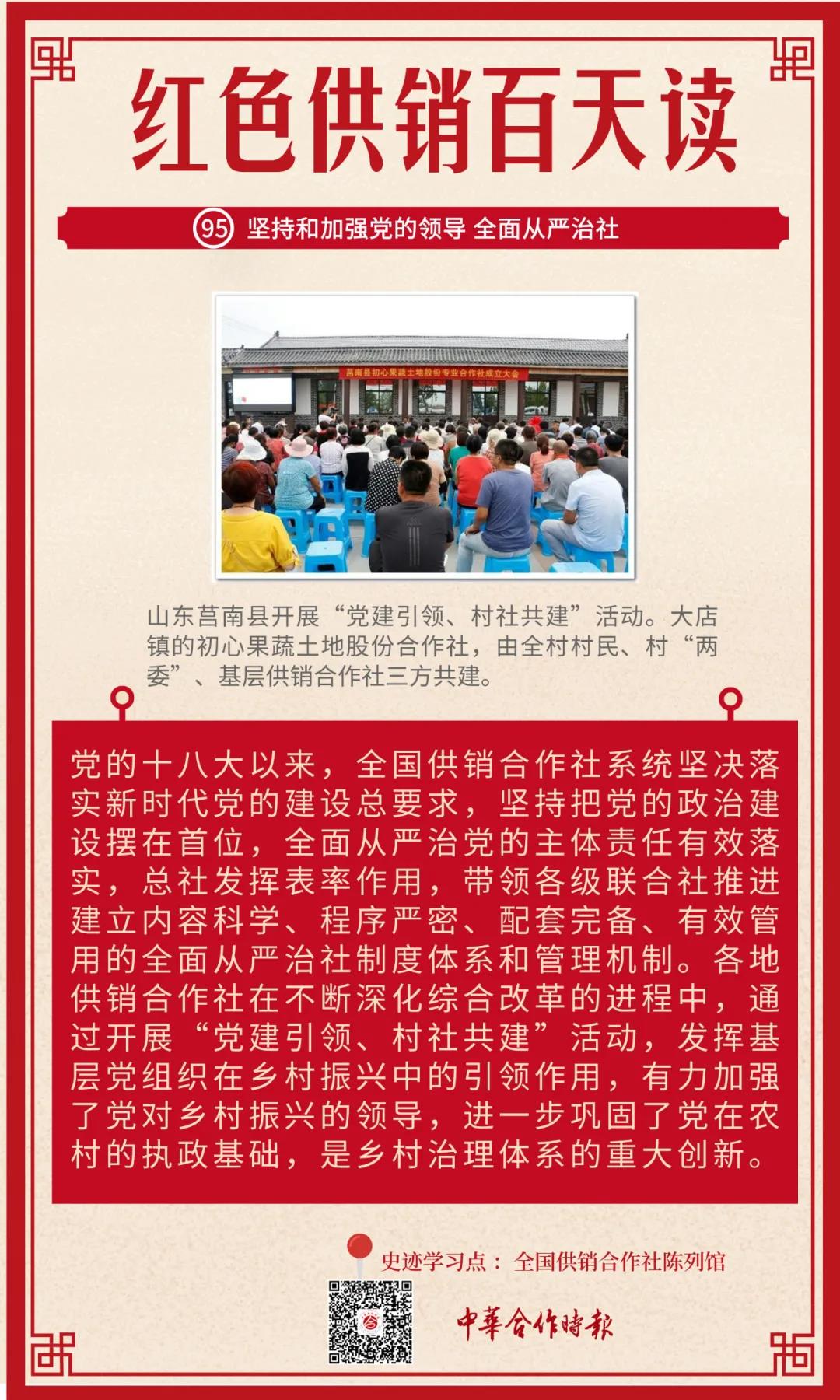 各地供销合作社在不断深化综合改革的进程中,围绕农村改革新形势,采取单独组建、行业统建、村社联建、区域合建等方式,在基层供销合作社、农民合作社、农村综合服务社等为农服务组织或终端建立完善党组织,发挥基层党组织在乡村振兴中的引领作用。通过开展“党建引领、村社共建”活动,农村党的建设有了稳固的经济基础和更多更实的着力点,基层党组织的凝聚力明显增强,战斗堡垒作用有效发挥。“党建引领、村社共建”,是乡村治理体系的重大创新,通过经济工作促进政治工作,有力加强了党对乡村振兴的领导,进一步巩固了党在农村的执政基础。