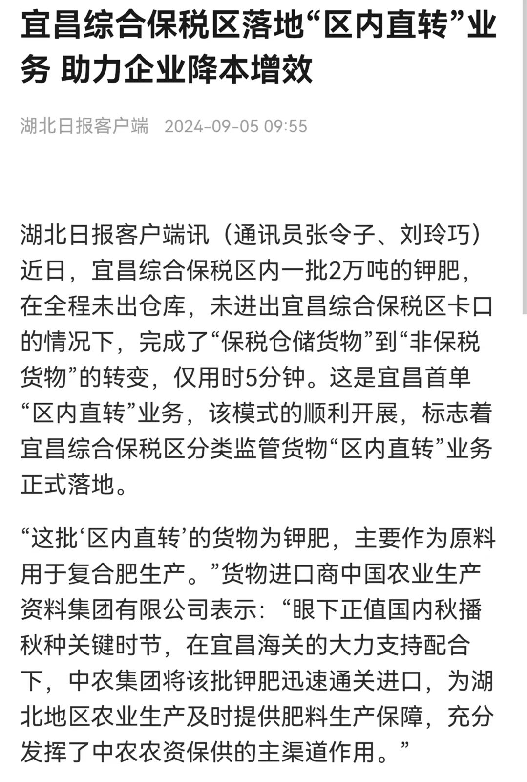 当前,正值国内秋种秋播关键时期。为确保化肥供应量足价稳,不误农时,近日,中农控股从宜昌保税区进口的一批钾肥,在保税区内实现直转后快速发往基层。