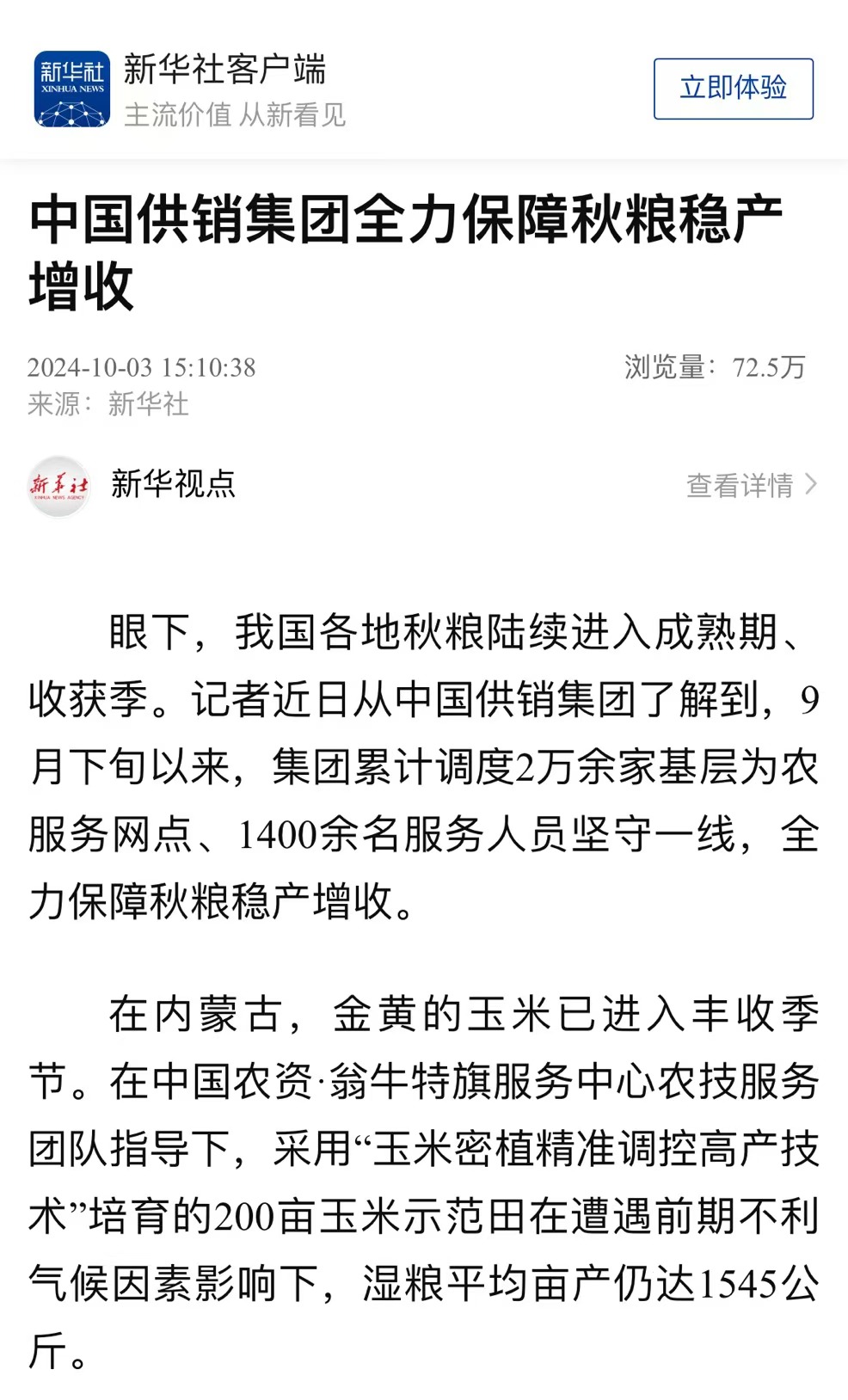 眼下,我国各地秋粮陆续进入成熟期、收获季。记者近日从中国供销集团了解到,9月下旬以来,集团累计调度2万余家基层为农服务网点、1400余名服务人员坚守一线,全力保障秋粮稳产增收。