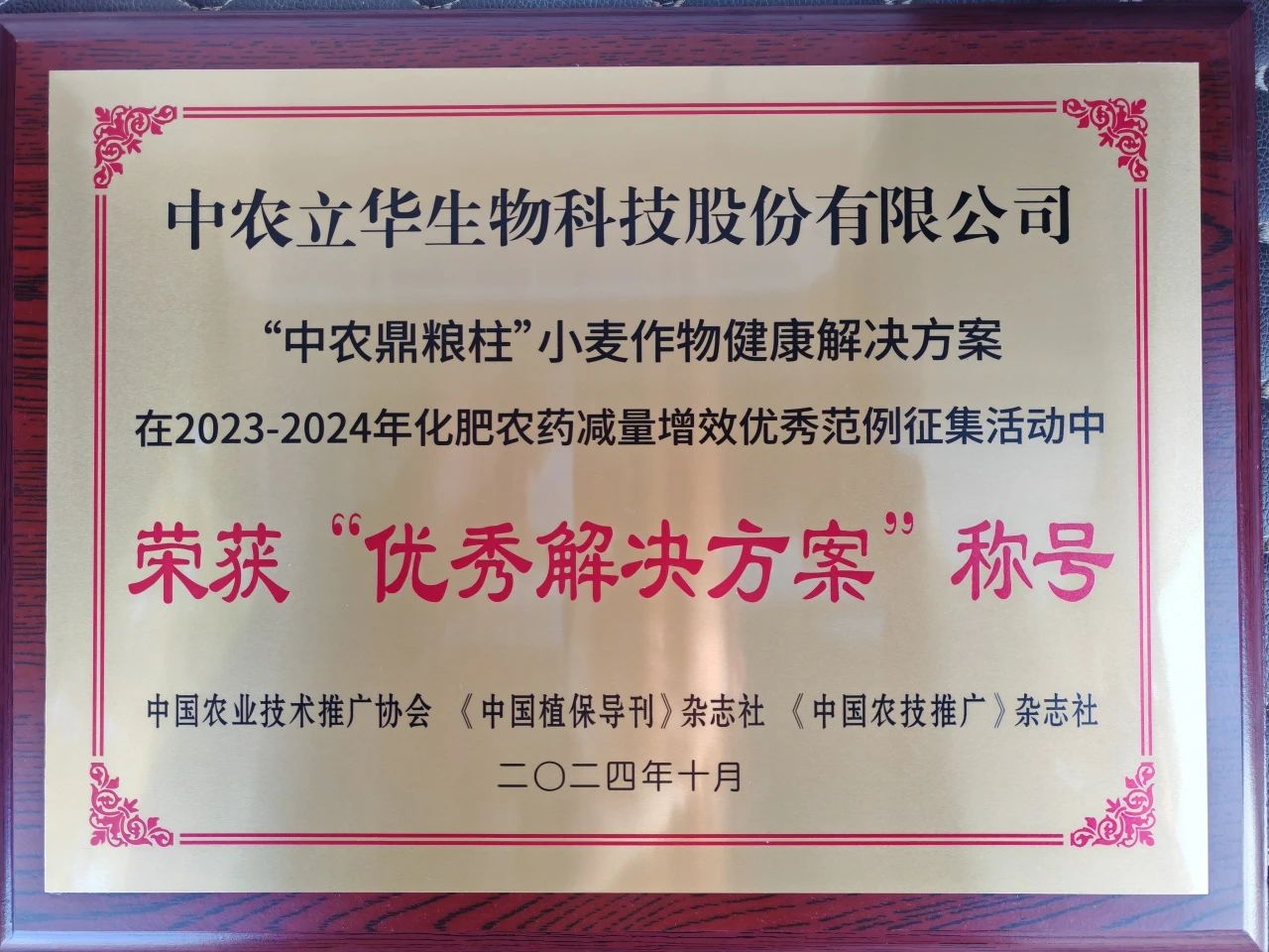 近日,中国农业技术推广协会、《中国农技推广》杂志社和《中国植保导刊》杂志社组织专家对前期征集的2023-2024年化肥农药减量增效优秀范例进行了初评和复评,中农立华生物科技股份有限公司推出的“中农鼎粮柱”小麦作物健康解决方案荣获“优秀解决方案”称号。