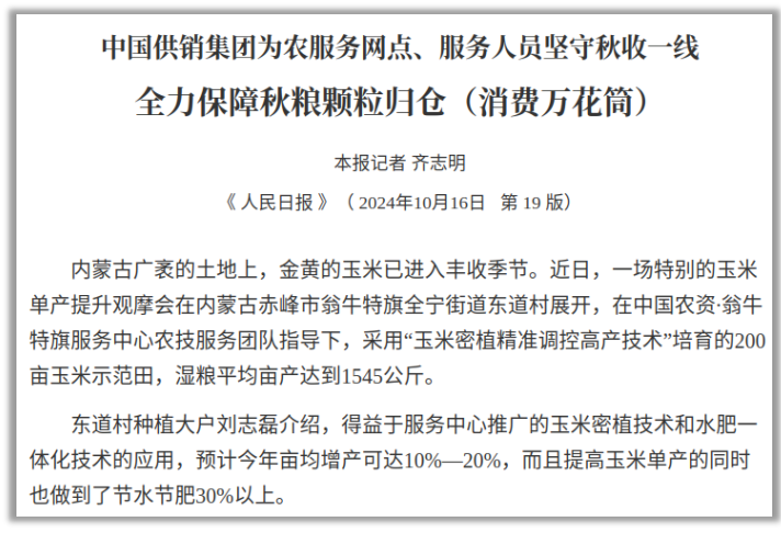 眼下,我国各地秋粮进入收获季。9月下旬以来,中国供销集团累计调度2万余家基层为农服务网点、1400余名服务人员坚守一线,全力保障秋粮颗粒归仓。
