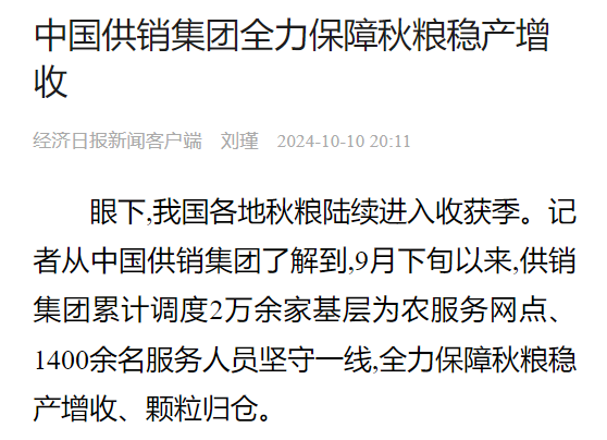 眼下,我国各地秋粮陆续进入收获季。记者从中国供销集团了解到,9月下旬以来,供销集团累计调度2万余家基层为农服务网点、1400余名服务人员坚守一线,全力保障秋粮稳产增收、颗粒归仓。