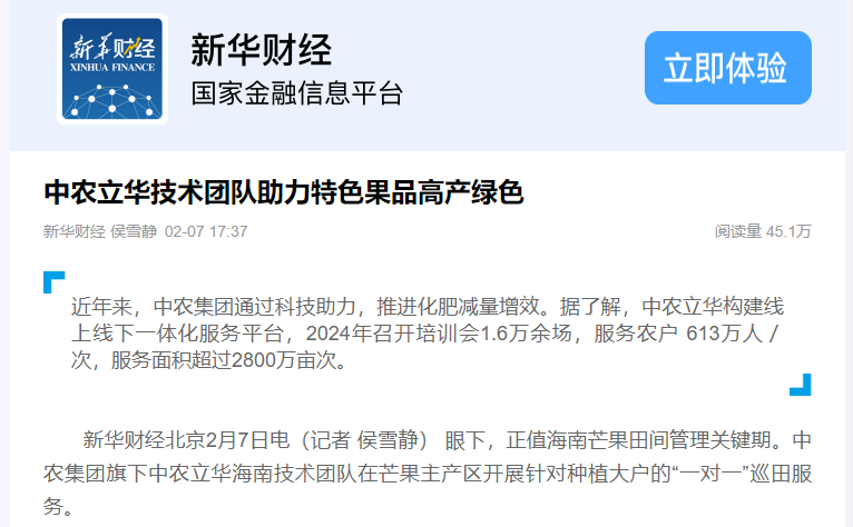 据了解,中农立华构建线上线下一体化服务平台,2024年召开培训会1.6万余场,服务农户 613万人/次,服务面积超过2800万亩次。线下,开展巡田、试验示范、农民培训会、田间观摩会等,向广大农户传授先进的农技知识,提升种植管理水平;线上,通过线上会议、直播和短视频,提供精准、多样化的内容,并不断创新农技课堂形式。