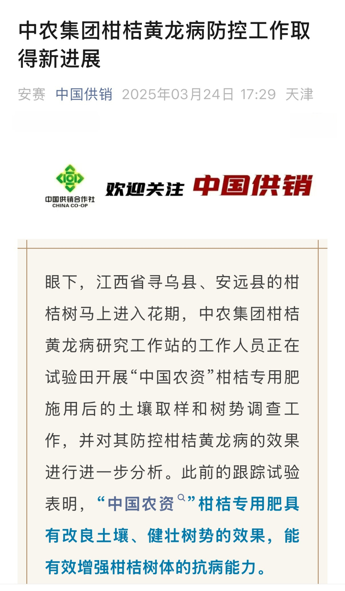 3月24日,中国供销微信公众号刊发《中农集团柑桔黄龙病防控工作取得新进展》。