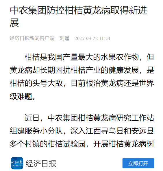 3月22日,经济日报新闻客户端刊发《中农集团防控柑桔黄龙病取得新进展》。