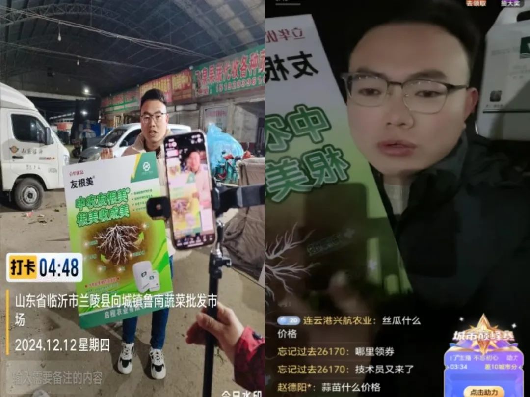 除了送关怀,张少驰还借助新媒体的力量。每天早上5点半,他都会和合作伙伴在蔬菜批发市场开启直播,为农户播报实时菜价。这一贴心的服务,让农户能根据价格合理安排采摘,深受大家欢迎。在直播过程中,张少驰也巧妙地融入“友根美”的介绍,提醒农户关注作物根部健康,用专业知识和热情态度,慢慢让农户对产品有了印象。