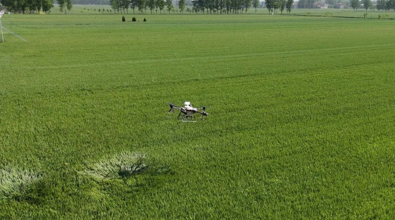 目前,技术团队已经形成了一套符合许昌小麦苗情的本地化方案,同时引入无人机飞防,对连片麦田实施高效统防统治,单机日均作业面积超400亩,既解决了小农户分散田块施药难题,又确保了药剂均匀覆盖,科学、高效遏制纹枯病的发病范围。