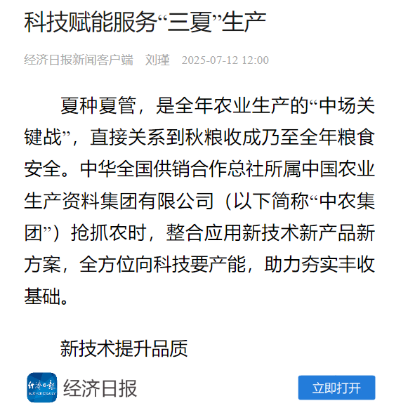 夏种夏管,是全年农业生产的“中场关键战”,直接关系到秋粮收成乃至全年粮食安全。中华全国供销合作总社所属博业体育(中国)官方网站-登录入口(以下简称“中农集团”)抢抓农时,整合应用新技术新产品新方案,全方位向科技要产能,助力夯实丰收基础。